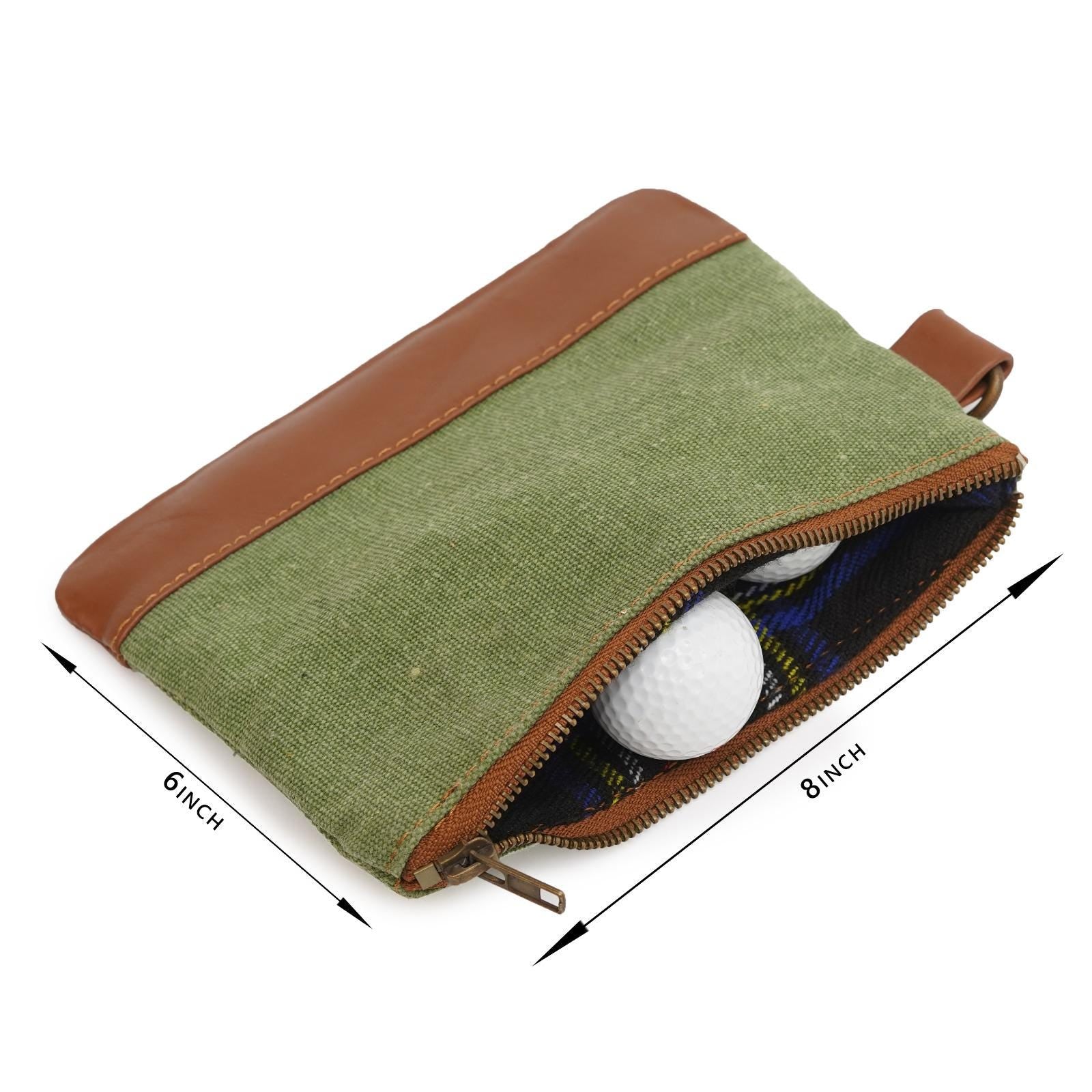This stunning Canvas golf ball pouch is Handcrafted from the Canvas and Leather Trim with durable zipper and Brass D-Ring. This pouch is the perfect place to store your valuables, phone, wallet, keys etc... while you are on the course. It also makes for a great tee and golf ball pouch! This handmade Pouch goes perfectly with any golf bag for easy Golf Balls Storage. The solid brass D-Ring allows you to easily attach to any golf bag.
